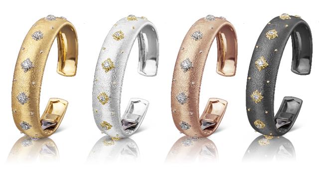 ????源自意大利米蘭的布契拉提是世界最著名的高級珠寶商之一,由有“金匠王子”之稱的Mario Buccellati于1919年創(chuàng)立,品牌成立至今,吸引了眾多尊貴顧客,當(dāng)中包括意大利、西班牙、埃及皇室和羅馬主教。布契拉提以其手工藝、設(shè)計和獨(dú)一無二的作品聞名。直至今日,布契拉提珠寶不僅僅因其設(shè)計和卓越手工藝獲得全世界青睞,更值一提的是工坊堅持采用能夠追溯至意大利文藝復(fù)興時期的經(jīng)典雕刻技術(shù)。布契拉提珠寶以其獨(dú)門的“織紋雕金”創(chuàng)造出輕柔的“絲綢”效果,不同的黃金“編織”技巧,加之巧妙鑲嵌的各種寶石,其精美纖麗的風(fēng)格令人贊嘆不已。