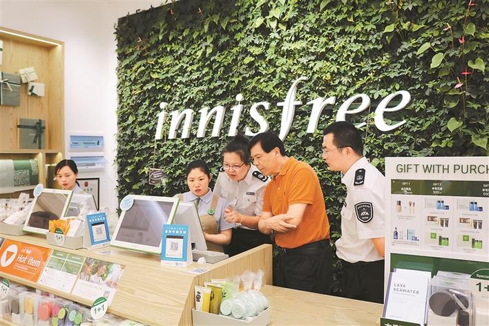 執(zhí)法人員檢查化妝品店。