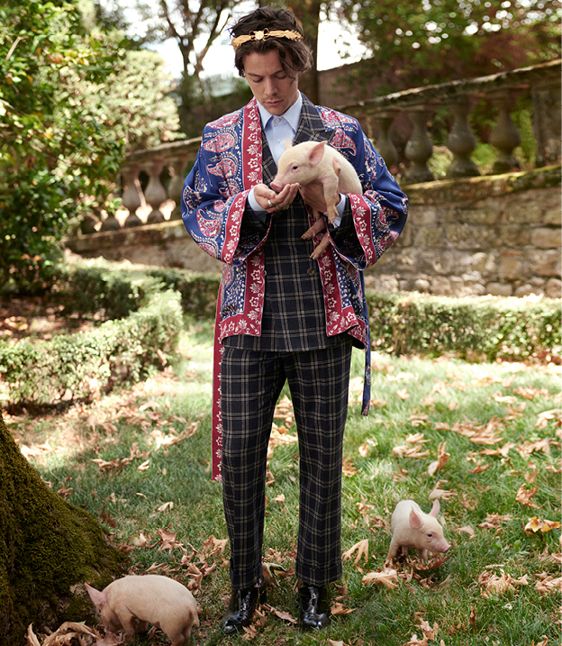 身處16世紀文藝復興時期風格主義的意大利別墅花園,哈里·斯泰爾斯穿上全新都會男士正裝系列,當中獨特的圖案、彩色提花、嵌花編織、貼飾,配合別具一格的裁剪比例,將古馳的當代美學展現(xiàn)得淋漓盡致。