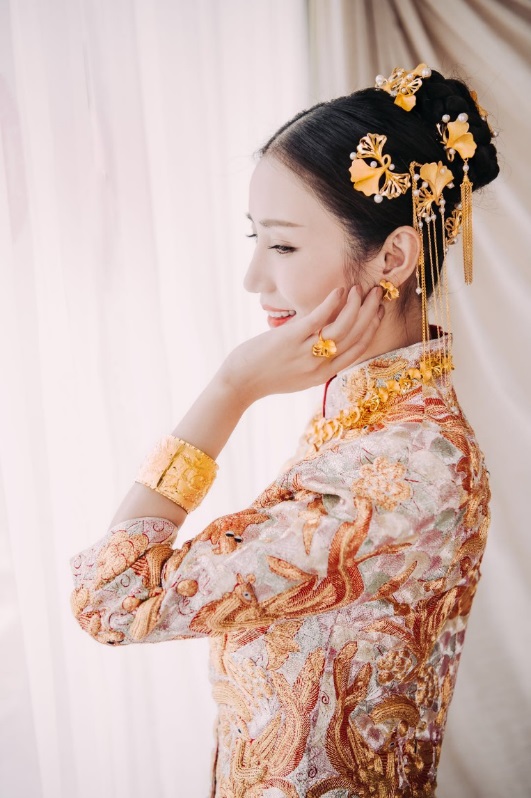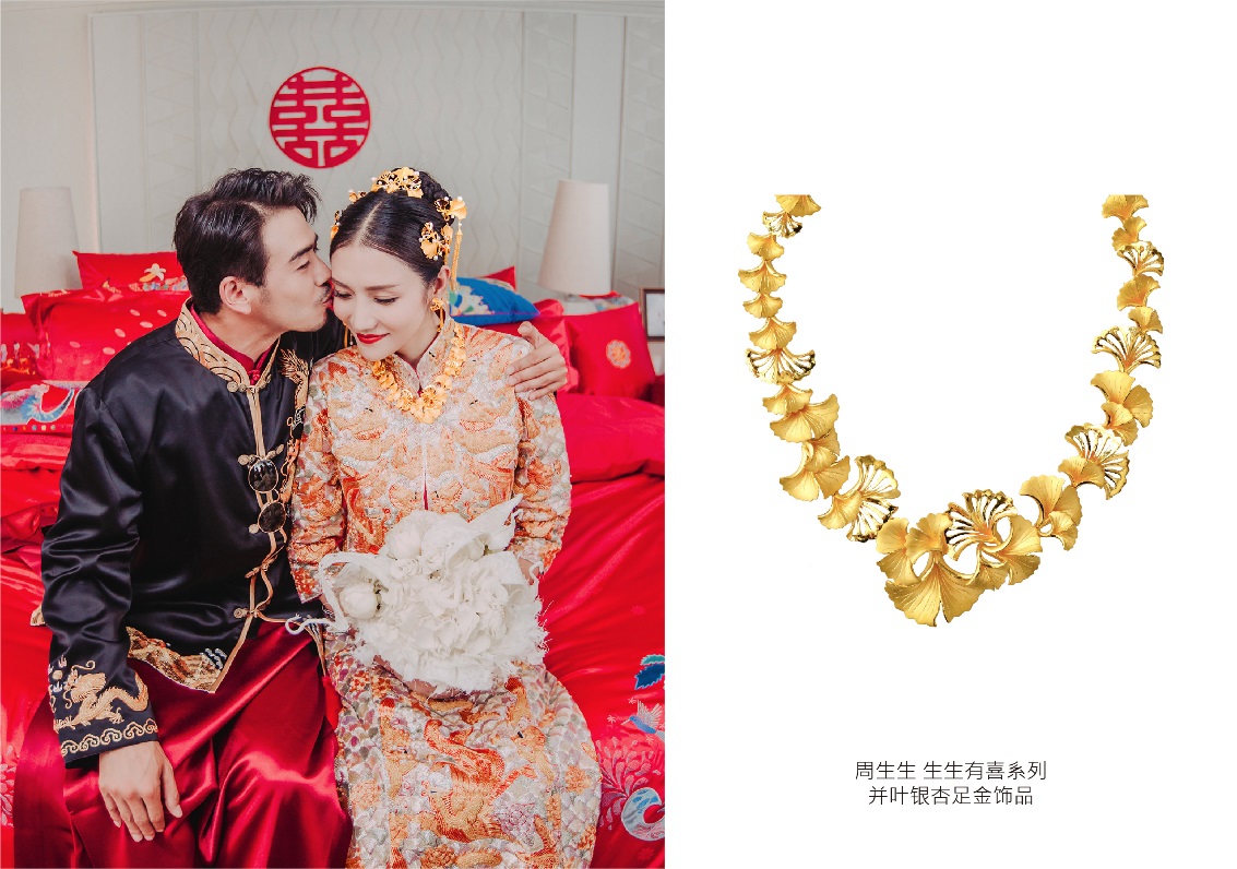 良辰吉時(shí),鳴鳳鏘鏘。每一個(gè)喜字,每一抹紅色,都將成為這場愛情的最好詮釋。迎親環(huán)節(jié),楊爍夫婦兩人身著中式禮服,金色圖騰配以富貴花朵刺繡,與生生有喜系列并葉銀杏足金項(xiàng)鏈及耳環(huán)相輔相成,搭配新娘清麗的妝容,散發(fā)著中國女性傳統(tǒng)古典的東方美。鳳冠霓裳,纓絡(luò)垂旒,配上生生有喜系列足金龍鳳手鐲,經(jīng)典的搭配亦不失傳承的意義,寓意龍鳳呈祥,成雙成對。