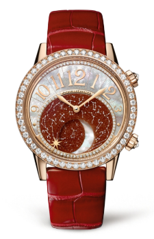 積家 Rendez-Vous Moon約會(huì)系列月相腕表玫瑰金款呈現(xiàn)奔放熱情的迷人魅力,精致閃耀的表殼宛如一曲獻(xiàn)給璀璨夜空的頌歌。腕表以無(wú)限詩(shī)意展現(xiàn)大工坊制表大師的精湛技藝,浩瀚縹緲的星空?qǐng)D案鐫刻于腕表之上,令人沉醉。熱情的火光色彩“鋪滿”玫瑰金表殼之上,紫紅色砂金石表盤呈現(xiàn)北半球的浩渺蒼穹。表盤和表殼均以鉆石鑲嵌,流光溢彩。珍珠母貝打造的一彎明月在浩瀚星空中緩緩移動(dòng),與顯示數(shù)字時(shí)標(biāo)的表盤采用相同工藝打造,散發(fā)皎潔光彩。一枚星形指針,以最富詩(shī)意的方式提示著佩戴者下一個(gè)約會(huì)的時(shí)間。
