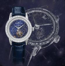 積家 Master Grande Tradition Tourbillon Céleste超卓傳統(tǒng)陀飛輪大師系列星空腕表以讓人目眩神迷的方式詮釋時(shí)間。為了充分展現(xiàn)腕表的天文特性,軌道式飛行陀飛輪顯示的為恒星時(shí)間而非太陽(yáng)時(shí)間,比太陽(yáng)時(shí)間縮短近四分鐘。在這款腕表的表盤外沿,附帶太陽(yáng)標(biāo)志的指針以24小時(shí)為一周在表盤上轉(zhuǎn)動(dòng)。表圈顯示了24小時(shí)刻度、黃道十二宮星座與月份。軌道式飛行陀飛輪與星辰和星座同步運(yùn)轉(zhuǎn),和表盤共演一段恒星之舞。