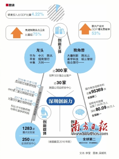其一,企業(yè)主導(dǎo),政府給力。在整個(gè)創(chuàng)新體系中,企業(yè)是技術(shù)創(chuàng)新主體,代表著市場(chǎng)取向;政府是制度創(chuàng)新的主體,主要任務(wù)是營造良好的創(chuàng)新環(huán)境,彌補(bǔ)市場(chǎng)失靈的不足。只有處理好政府和市場(chǎng)的關(guān)系,才能推動(dòng)整個(gè)創(chuàng)新體系不斷完善。因此,深圳一方面讓企業(yè)唱主角,支持企業(yè)創(chuàng)新創(chuàng)業(yè),華為、中興、騰訊、比亞迪等“龍頭”企業(yè)持續(xù)做大做強(qiáng),大疆創(chuàng)新、光啟、柔宇科技等“獨(dú)角獸”企業(yè)迅速發(fā)展;另一方面,政府從政策和規(guī)劃層面加強(qiáng)創(chuàng)新體系頂層設(shè)計(jì),圍繞科技管理機(jī)制創(chuàng)新、創(chuàng)業(yè)創(chuàng)新能力提升、強(qiáng)化對(duì)外合作等方面構(gòu)建政策支持體系,以企業(yè)為創(chuàng)新驅(qū)動(dòng)核心、以企業(yè)家群體為創(chuàng)新精神內(nèi)核、政策金融人才協(xié)同共生的創(chuàng)新生態(tài)系統(tǒng)加速形成。