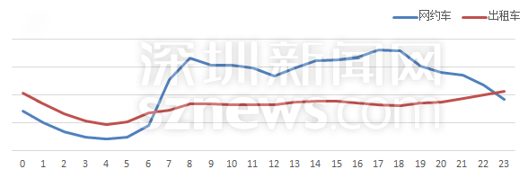 將網(wǎng)約車與出租車全天24小時行駛情況進行對比,發(fā)現(xiàn)網(wǎng)約車在日間活躍度明顯高于出租車,且在早晚高峰時段都有一個小的峰值,而出租車全日運行情況基本平穩(wěn)。
