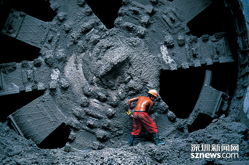 深圳地鐵的建設(shè)離不開(kāi)無(wú)數(shù)人的汗水,圖中建設(shè)工人正在清理盾構(gòu)機(jī)前的淤泥