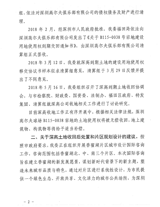 2018年2月,經(jīng)深圳市人民政府批準(zhǔn),深圳市規(guī)土委依法向深圳高爾夫俱樂(lè)部有限公司發(fā)出了《關(guān)于B0015-0038宗地建設(shè)用地使用權(quán)到期交回通知書》,由深圳高爾夫俱樂(lè)部有限公司清算組正式簽收。