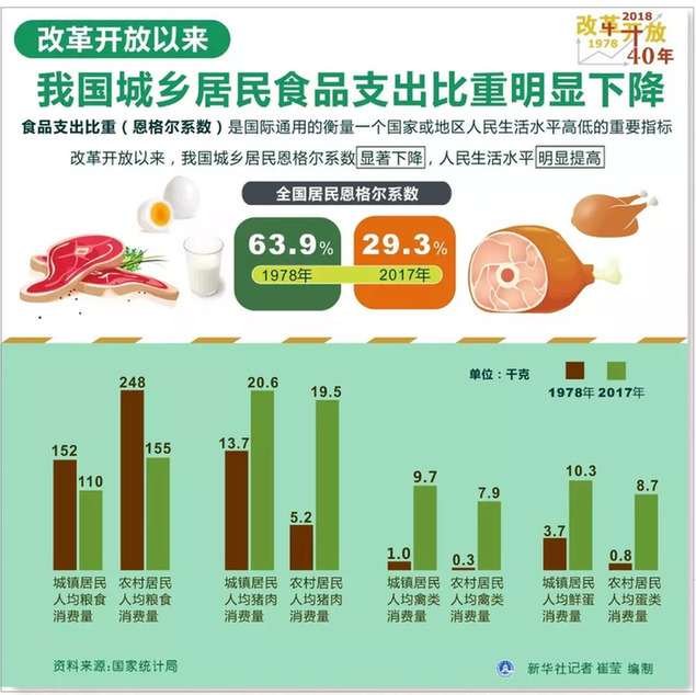 ② 國(guó)家統(tǒng)計(jì)局?jǐn)?shù)據(jù)顯示,改革開(kāi)放以來(lái),我國(guó)城鄉(xiāng)居民食品支出比重明顯下降。