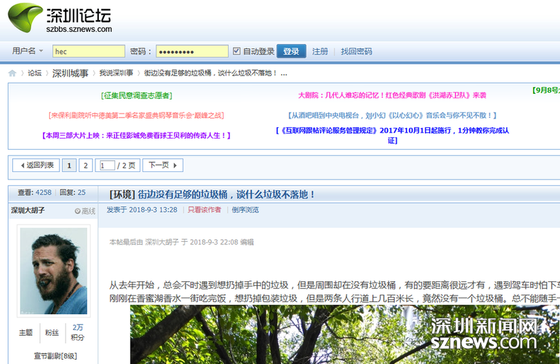 深圳新聞網9月6日訊(記者何暢)“街邊沒有足夠的垃圾桶,談什么垃圾不落地!”,網友“深圳大胡子”在深圳論壇發(fā)帖吐槽,自己在福田區(qū)香蜜湖香水一街附近想扔掉手中的垃圾,但是兩條人行道上幾百米長的路段竟然找不到一個垃圾桶!