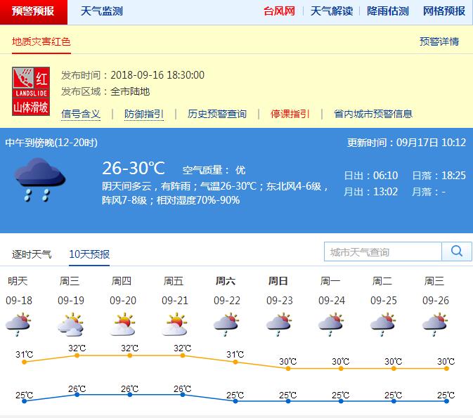 【深圳天氣趨勢】17日仍有間歇性陣雨,部分時(shí)間雨勢較大;18日多云有陣雨;19-21日,多云為主,局部地區(qū)有短時(shí)陣雨。今年第22號(hào)臺(tái)風(fēng)“山竹”(熱帶風(fēng)暴級(jí))17日10時(shí)位于位于廣西境內(nèi),距離我市595公里,繼續(xù)遠(yuǎn)離我市。深圳市氣象臺(tái)2018-09-1710:12:00發(fā)布。