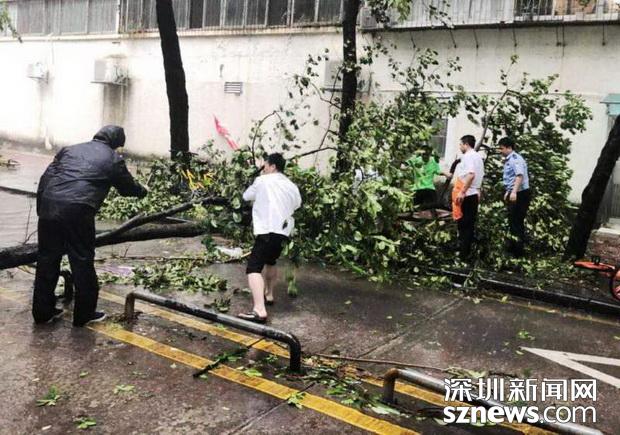 邊檢民警冒雨在執(zhí)勤現(xiàn)場搬挪被強(qiáng)臺風(fēng)刮倒的樹枝
