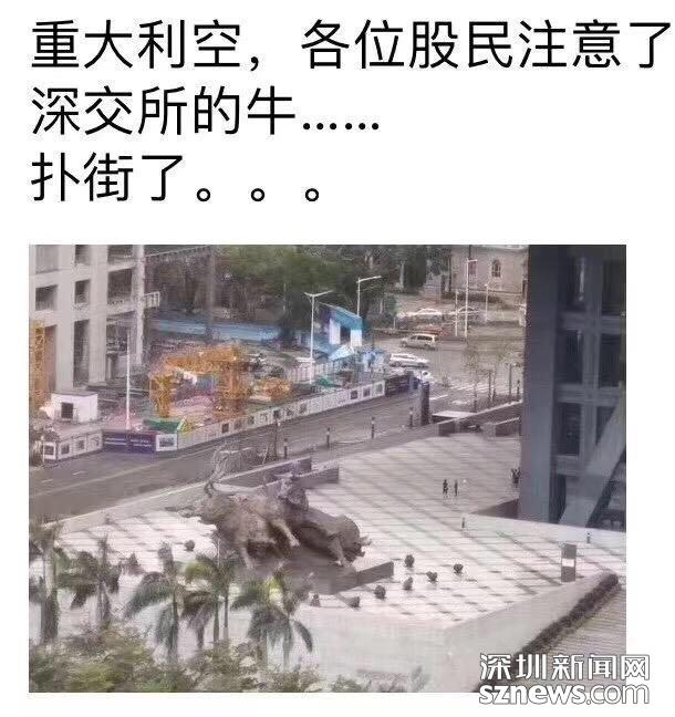 深圳新聞網(wǎng)9月18日訊(記者 張玲 實(shí)習(xí)生歐陽子瑜 張林羽 陸宇)關(guān)于“山竹”的各種段子特別多,博君一笑,未必是真。記者18日發(fā)現(xiàn),有一張像素極低的圖在網(wǎng)上流傳,照片中一頭牛雕塑臥倒在地,配文是:重大利空,各位股民注意了,深交所的牛,撲街了……