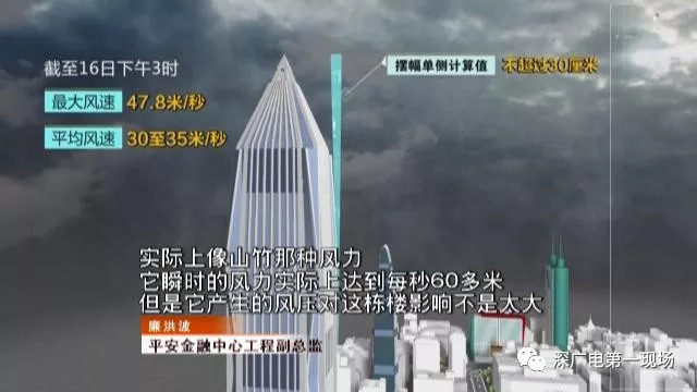 工程人員表示,平安金融中心抗風(fēng)設(shè)計能應(yīng)對平均風(fēng)速為60米/秒,陣風(fēng)風(fēng)速最高至80米/秒的臺風(fēng)。在此模擬情景下,塔頂擺幅單側(cè)計算值為67厘米。