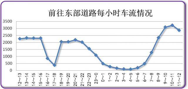 今日上午8時開始,東部回程的車輛增多,9時達(dá)到峰值,約1629輛。