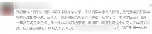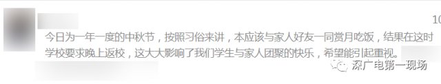 今天,深圳市高級(jí)中學(xué)、深圳市福田中學(xué)、沙井中學(xué)、東方英文書院的一些高中學(xué)生,通過(guò)在線留言等多種方式,向欄目反映,中秋節(jié)是法定假日,但他們卻沒(méi)法和家人一起吃飯團(tuán)聚,更別提賞月看晚會(huì)了,原因是學(xué)校要求寄宿的學(xué)生今天晚上要提早返校,參加晚自習(xí)或者考試。