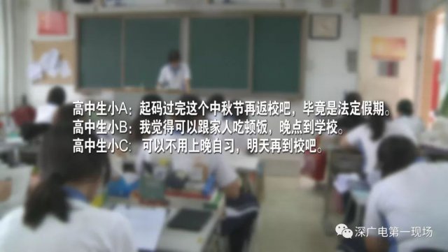 我們還了解到,就讀高三的學(xué)生只有周六放了一天假,從昨天開始就一直在上課,預(yù)計(jì)要上到國(guó)慶節(jié)才能休息,這樣算來(lái),學(xué)生一共要連上 8 天的課程。