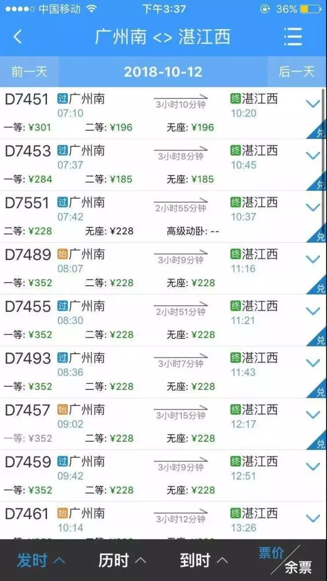 D7453次(7點37分班次)由原來的228元調(diào)整為185元;