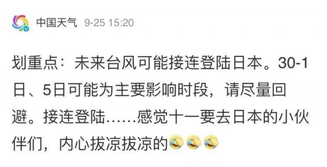 另據(jù) @廣州天氣,"潭美"28-29日最接近臺灣,隨后掉頭往東北方向移動,國慶期間前往臺灣的朋友不用擔心。