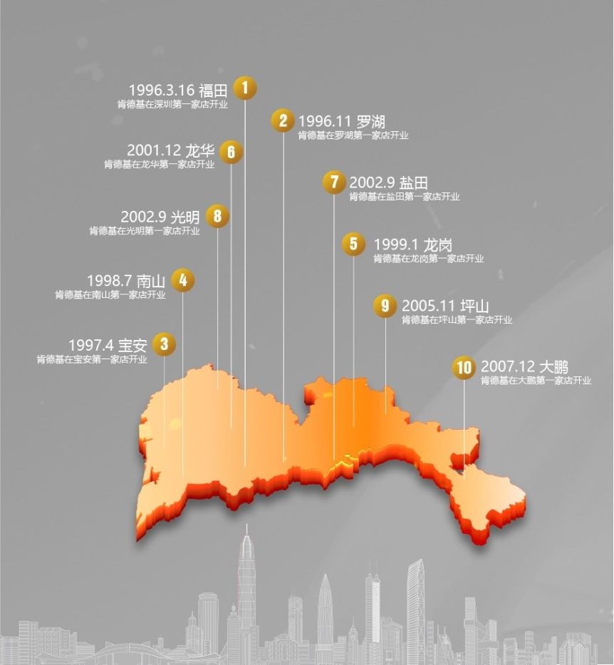 2007年,是深圳的大年份,也是肯德基的大年份。2007年,深圳人均GDP達(dá)到10684美元,首次超過(guò)1萬(wàn)美元。肯德基的開(kāi)店數(shù)量也在那一年突破了100家,達(dá)到108家。同時(shí),肯德基完成了對(duì)現(xiàn)在深圳十區(qū)的開(kāi)店布局。