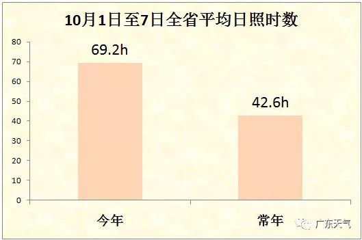 10月1日到7日,全省平均日照時(shí)數(shù):今年69.2h,常年42.6h,1951年以來(lái)排名第一。