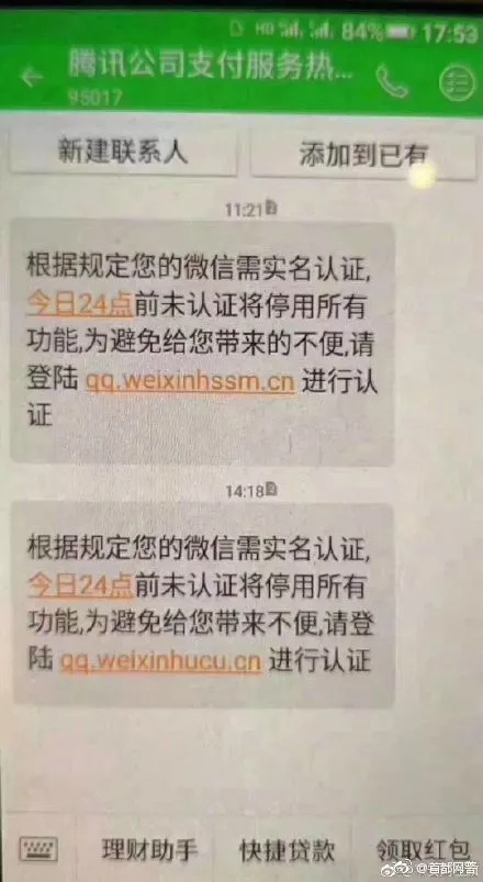 兩條短信中的實名認(rèn)證網(wǎng)址不一樣!