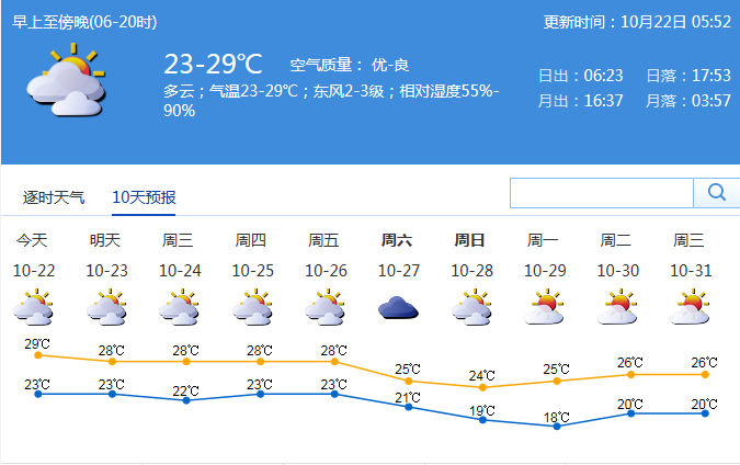 深圳新聞網(wǎng)訊 進(jìn)入10月中旬,西太平洋上的臺(tái)風(fēng)們終于“安靜”下來(lái),冷空氣逐漸成為接下來(lái)的主角,我國(guó)北方城市也紛紛步入秋季。盡管全市在10月11日早晨全市最低氣溫普遍在20℃左右,但距真正入秋還有一定距離。據(jù)市氣象局預(yù)測(cè),22日至26日我市大致多云,間中有小雨,最低氣溫22-24℃,最高氣溫27-29℃。