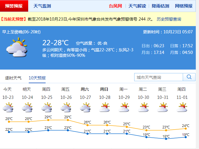 進(jìn)入10月以來,天氣漸漸轉(zhuǎn)涼,目前已有兩次明顯冷空氣影響深圳,主要出現(xiàn)在10月11日至12日、16日至17日,10月27日至29日還將有冷空氣。據(jù)了解,與去年相比,今年冷空氣來得早一些,最早在9月上旬就有冷空氣影響了,冷空氣的頻次也相對(duì)較多,但強(qiáng)度都不是太強(qiáng),所以總體氣溫較舒適。