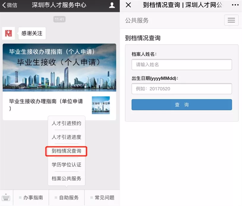 關(guān)注“深圳市人才服務(wù)中心”公眾號(hào)查詢到檔情況,辦理檔案相關(guān)業(yè)務(wù)。