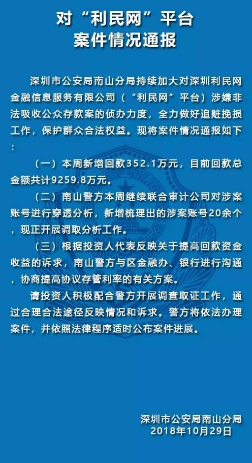 10月29日,深圳南山公安通報(bào)五家涉嫌非法集資犯罪的P2P平臺(tái)案件情況。五家平臺(tái)分別是“中融投”“投之家”“零錢罐”“利民網(wǎng)”“金融圈”平臺(tái)。