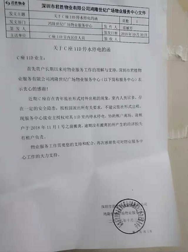 10月30日鴻隆世紀(jì)廣場(chǎng)物業(yè)服務(wù)中心物業(yè)發(fā)出關(guān)于 C座11D停水停電函,表示 C座存在青年旅社形式對(duì)外出租的現(xiàn)象,室內(nèi)人員居多,存在安全隱患,按桂園派出所有關(guān)要求,不建議旅社形式出租。業(yè)主授權(quán)物業(yè)中心對(duì)11D進(jìn)行室內(nèi)停水停電,協(xié)助租戶離場(chǎng),并要求租戶于11月1日之前搬離。