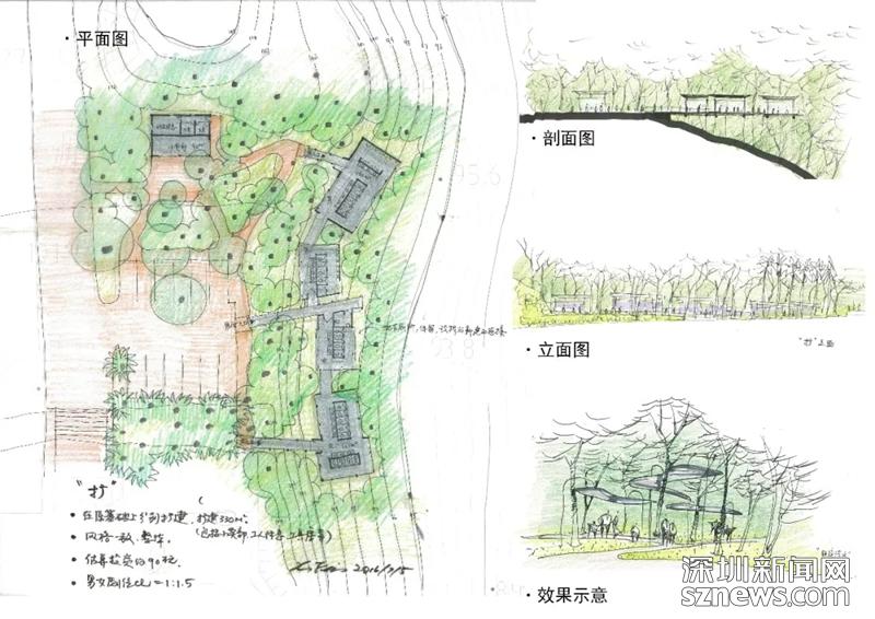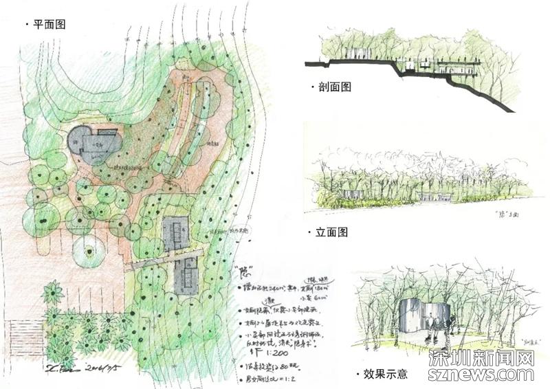 費曉華在文中提到,“隨著深圳人口和游客的劇增,蓮花山頂公共廁所已不堪負(fù)重,急需擴大規(guī)模。2016年,本人受蓮花山公園管理處的邀請,免費為他們提供了改擴建方案。方案共有兩種思路:‘隱擴’和‘顯擴’,均是在保留原建筑的基礎(chǔ)上,擴大使用面積以滿足更多人的需求。從更好地保護自然環(huán)境的角度出發(fā),本人推薦‘隱擴’方案。” (附設(shè)計圖)
