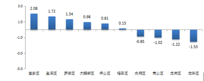 從各區(qū)(新區(qū))城市交通文明進(jìn)步指數(shù)來(lái)看,福田區(qū)、羅湖區(qū)、鹽田區(qū)、寶安區(qū)、坪山區(qū)和大鵬新區(qū)均有所進(jìn)步,其中寶安區(qū)進(jìn)步最大,進(jìn)步指數(shù)為2.08%,鹽田區(qū)次之,進(jìn)步指數(shù)為1.72%;而南山區(qū)、龍崗區(qū)、光明區(qū)和龍華區(qū)則有所退步,其中龍華區(qū)和龍崗區(qū)退步較大,進(jìn)步指數(shù)分別為-1.53%和-1.22%(見圖4)。