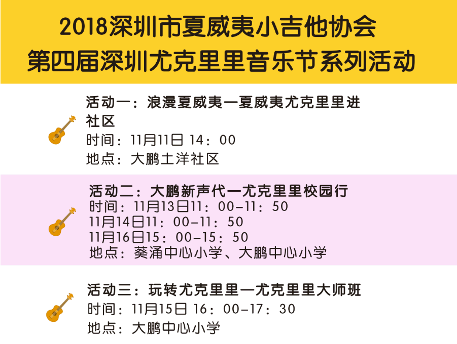 其中全民參與嘉年華音樂會11月17日的將會在深圳市玫瑰海岸沙灘舉辦,有深圳、香港(中國)、臺灣(中國)、美國、日本、廣州、中山、珠海等地的嘉賓和愛好者近50組表演者帶來4小時尤克里里盛會,表演者年齡跨度更是從5歲到60歲。嘉年華現(xiàn)場除了尤克里里音樂會,還將有Moana夏威夷呼拉舞風(fēng)情體驗,中國臺灣尤克里里協(xié)會會長陳建廷新書《兒童尤克里里英文暢游》深圳首發(fā),中國臺灣尤克里里世界大賽冠軍蔡皓怡原創(chuàng)專輯《航海日志》深圳首發(fā),以及美國尤克里里音樂家、藝術(shù)家新專輯《粉色海豚》尤克里里專輯中國大陸首發(fā)。