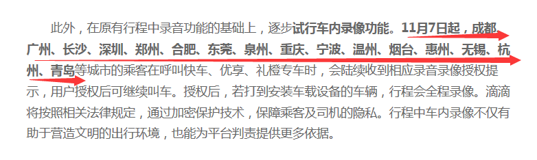 11月7日起,滴滴升級(jí)安全措施,在深圳等城市試行車(chē)內(nèi)錄像功能