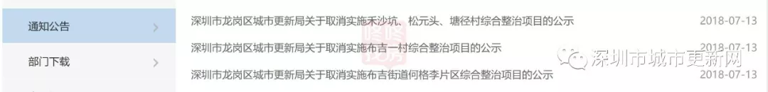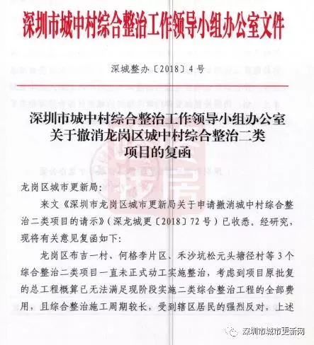 事實上,早在2018年7月,龍崗區(qū)城市更新局就已經(jīng)依據(jù)相關(guān)規(guī)定要求,批復(fù)取消這幾個城中村實施綜合整治的申請,并予以公示。此次的批復(fù)公告實際為區(qū)城市更新局向上級城中村綜合整治領(lǐng)導(dǎo)和決策機構(gòu)(深城整辦)的請示文件所反饋的意見復(fù)函。