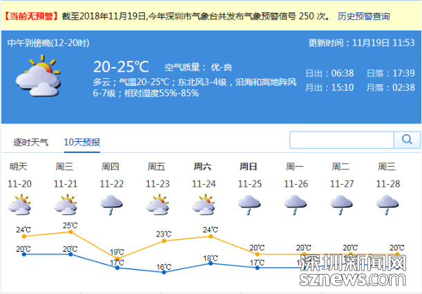 市氣象局預計,11月20-21日,深圳市以多云間陰天為主,部分時間有零星小雨; 22日受冷空氣影響,有小雨,北風加大,氣溫下降,天氣轉(zhuǎn)涼,日溫差小。23-24日,以多云天氣為主,可見陽光,早晚清涼。
