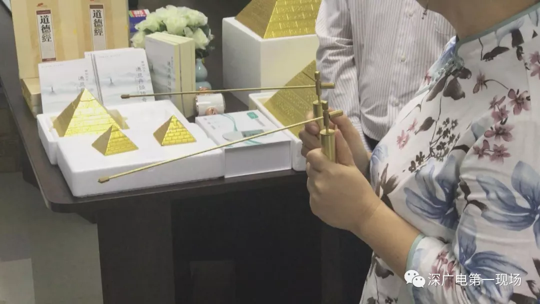 一開(kāi)始,就上來(lái)了一位叫許姐的團(tuán)隊(duì)負(fù)責(zé)人,但她并沒(méi)有著急介紹主角“萬(wàn)能金字塔”,而是不慌不忙地賣弄起另一樣所謂的“神器”——尋龍尺。