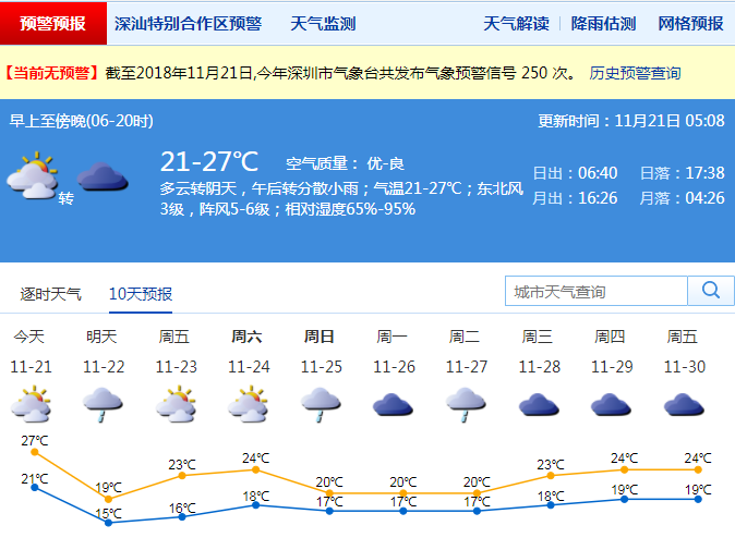 市氣象局預(yù)計,20日17-20時,深圳市以多云天氣為主;氣溫在22-25℃;相對濕度65%-85%;偏北風(fēng)3-4級,陣風(fēng)5-6級;全市能見度大部分地區(qū)在10公里以上。傍晚天氣舒適,適合戶外運動。21日夜間至22日冷空氣影響,有小雨,北風(fēng)加大,沿海和高地最大陣風(fēng)7-8級,22日最低氣溫會降至15℃左右;23-24日晴天間多云,氣溫回升;25-26日,陰天有陣雨。