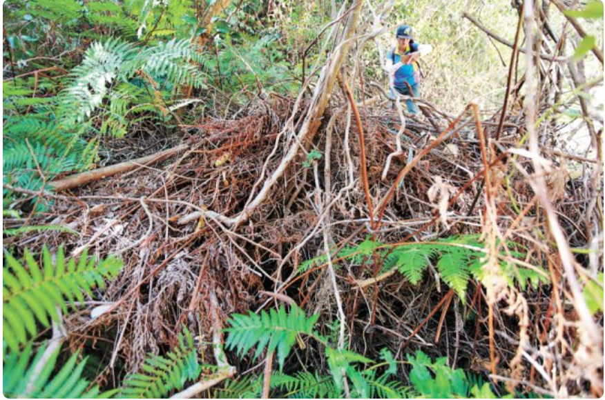 山谷中一個長約50米、寬約30米的采石現(xiàn)場赫然出現(xiàn)在眼前。大量碎石被整齊碼放在山坡上,在溪水流經(jīng)的兩塊巨石上,散落著幾根鋼筋撬棍、幾把小鐵錘,還有一些塑料刷子和手套。在現(xiàn)場西側的一片小樹林下,堆放著十幾根被鋸斷的樹干,走近一看,樹干里放著鋼鋸等工具。在樹干上方,則是一堆用塑料繩捆扎好的、已經(jīng)枯黃的藤類和蕨類植物,經(jīng)辨認,這里有相當一部分是國家二級保護植物"金毛狗"。此外,在采石現(xiàn)場北側,可以看到一些還沒有被挖掉的蕨類植物,這些則是幸免于難的殘存"金毛狗"。