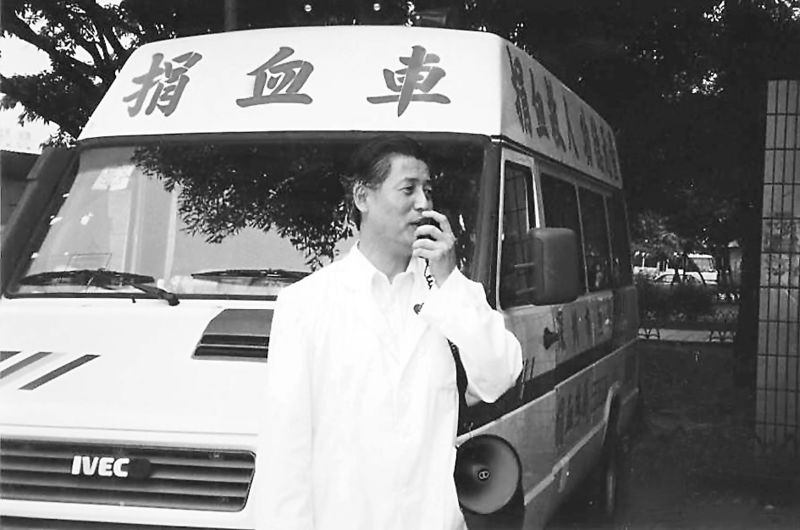 1995年5月7日,捐血車第一天開上街頭,血站老站長(zhǎng)楊春森拿著擴(kuò)音器大嗽叭向市民宣傳。 余海蓉 攝