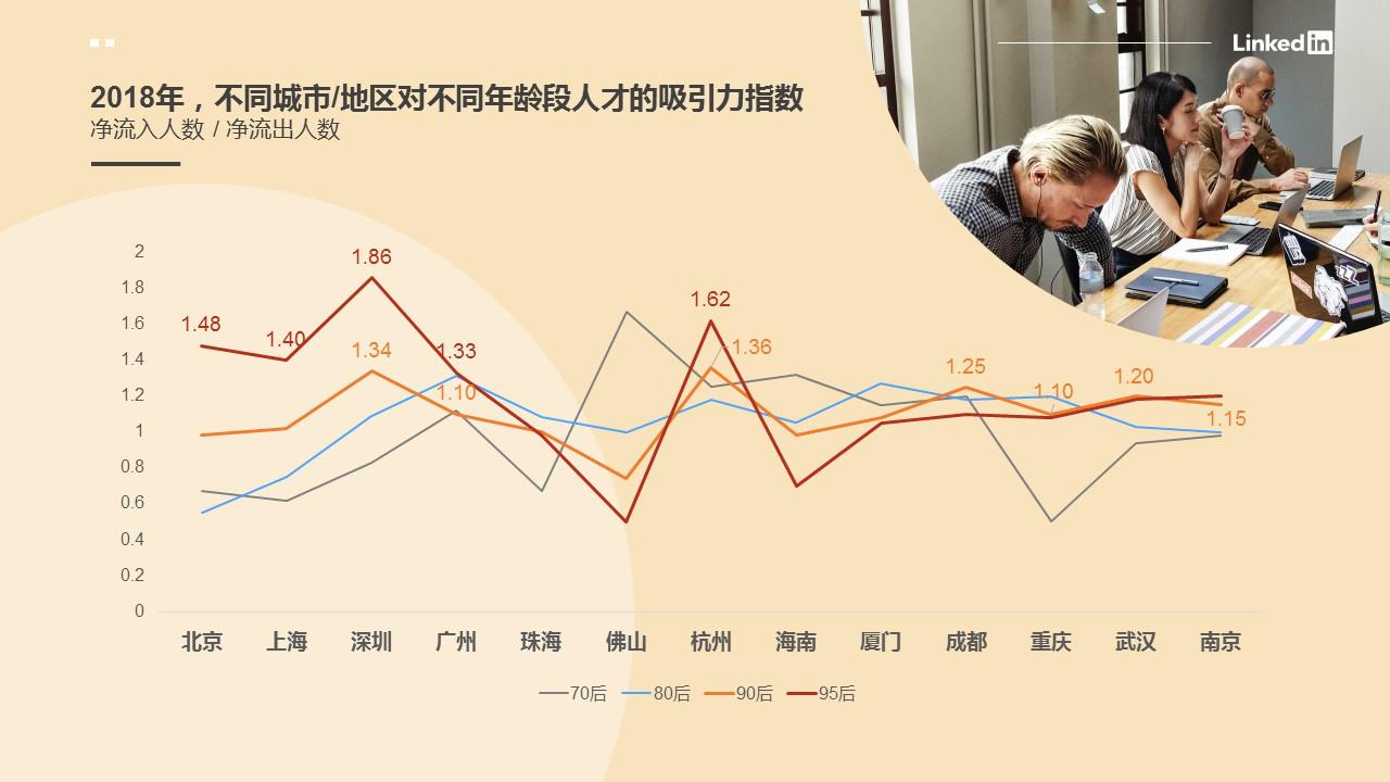 通過對比不同城市及地區(qū)的人才吸引力指數(shù)(凈流入人數(shù)/凈流出人數(shù)),領(lǐng)英數(shù)據(jù)顯示:對于新畢業(yè)的95后年輕人來說一線城市仍是畢業(yè)后職場起步的首選。