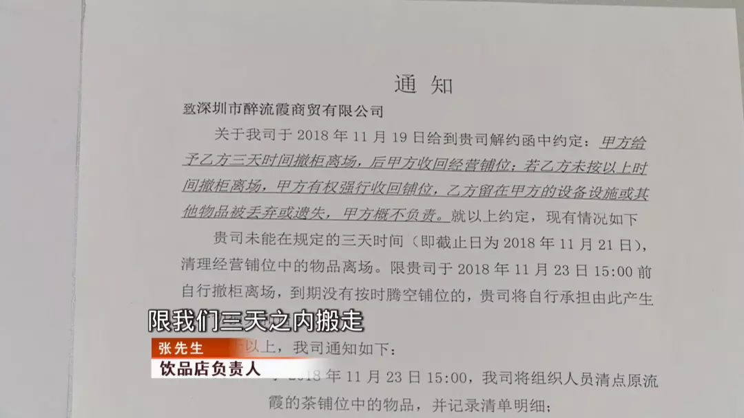 記者在飲品店墻上看到了一則通知,優(yōu)米道商場以飲品店拖欠租金為由與其解約,限飲品店在11月23日15點前自行離場,到期不按時騰空鋪位,飲品店將要承擔(dān)由此產(chǎn)生的一切損失和后果。