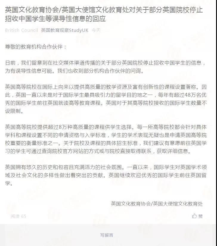記者發(fā)現(xiàn),英國文化教育協(xié)會/英國大使館文化教育處對關(guān)于部分英國院校停止招收中國學生這一信息已做出官方回應:他們留意到在社交媒體渠道傳播的關(guān)于部分英國院校停止招收中國學生的信息,為有誤導性信息可能。
