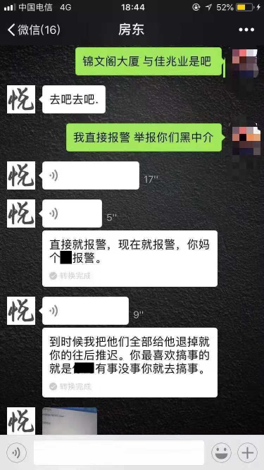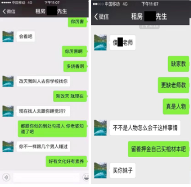 追索押金的過(guò)程并不平靜。10月13號(hào)的一次微信溝通中,余某亮對(duì)李小姐以文字和色情圖片進(jìn)行人身恐嚇、辱罵和性騷擾。記者還獲悉,余某亮至少對(duì)2人女租客進(jìn)行過(guò)性騷擾,也有男租客稱(chēng)受到余某亮等人的人身恐嚇。