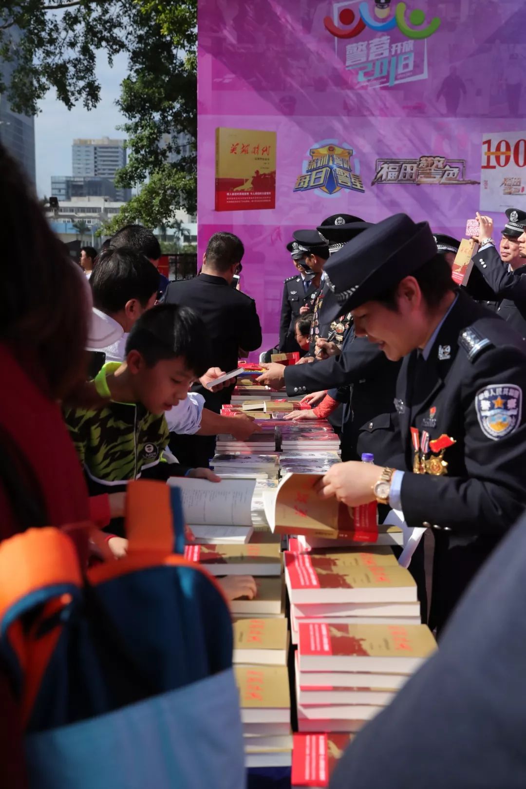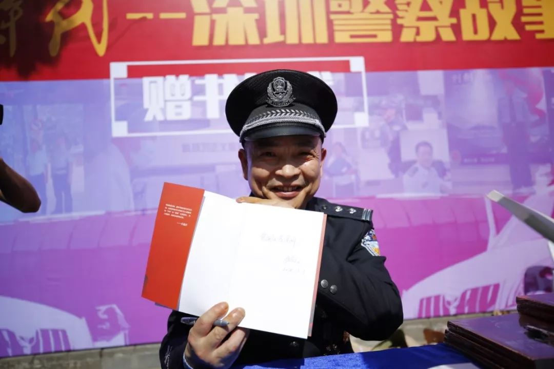 當(dāng)天上午,人民公安出版社副總編李國(guó)強(qiáng)、著名作家李迪與市公安局領(lǐng)導(dǎo)來(lái)到福田分局開(kāi)放點(diǎn)現(xiàn)場(chǎng)為深圳公安“每日警星”代表簽名贈(zèng)書(shū)。在贈(zèng)書(shū)點(diǎn),許多市民排起了長(zhǎng)隊(duì),領(lǐng)取《英雄時(shí)代——深圳警察故事》。