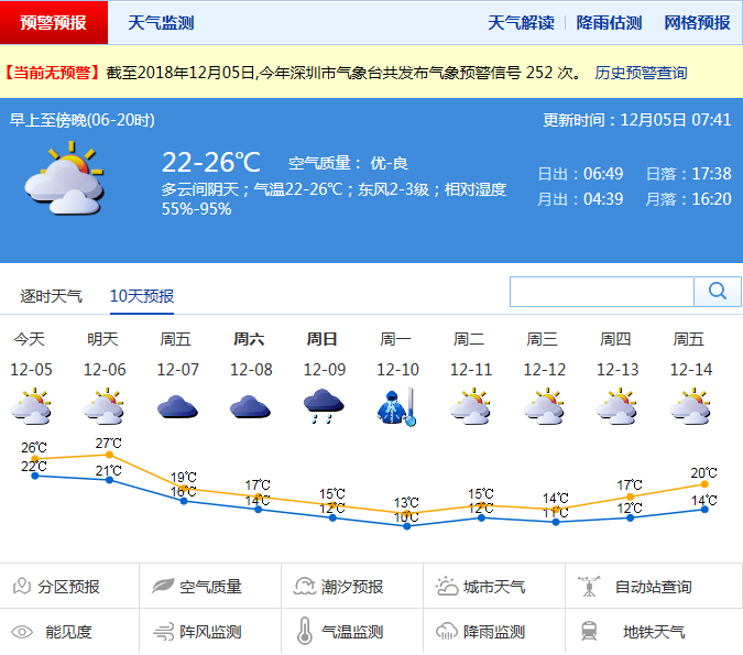 記者從深圳氣象局獲悉,5-6日陰天間多云,早晚有輕霧,間中有零星小雨,5日氣溫20-26℃;7-8日陰天有分散小雨,北風加大,氣溫下降,天氣轉(zhuǎn)涼;9-11日有中雨局部可達大雨,氣溫進一步下降,最低氣溫降至10℃左右,天氣陰冷。