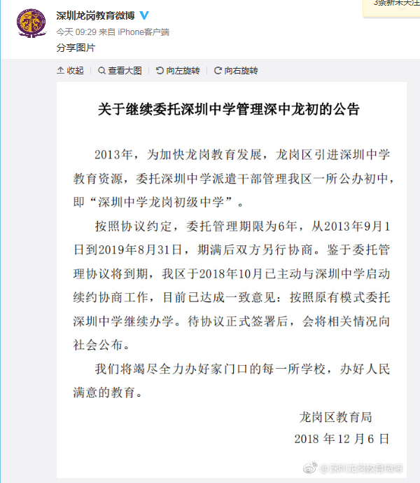 據(jù)了解,從11月底開始,深圳中學(xué)將撤離龍崗的消息就在網(wǎng)絡(luò)上不脛而走,學(xué)區(qū)內(nèi)的業(yè)主在得知這個(gè)消息后,有些不知所措,紛紛通過各種渠道打聽消息,有些業(yè)主直接找到龍崗區(qū)教育局求證。12月6日,深圳龍崗教育官方微博發(fā)布公告,目前已達(dá)成一致意見:按照原有模式委托深圳中學(xué)繼續(xù)辦學(xué)。