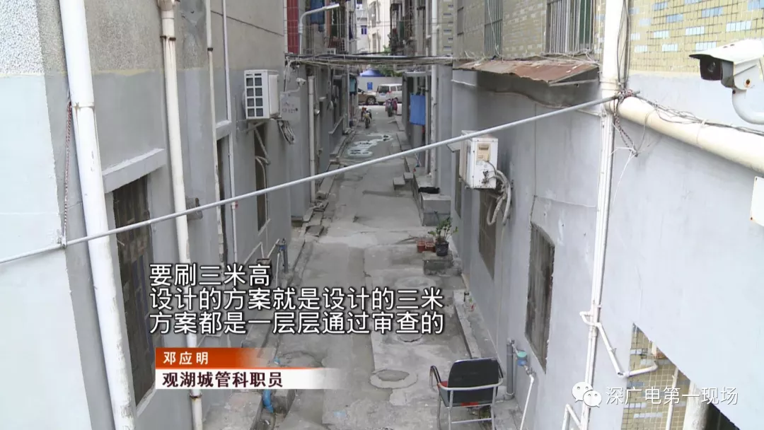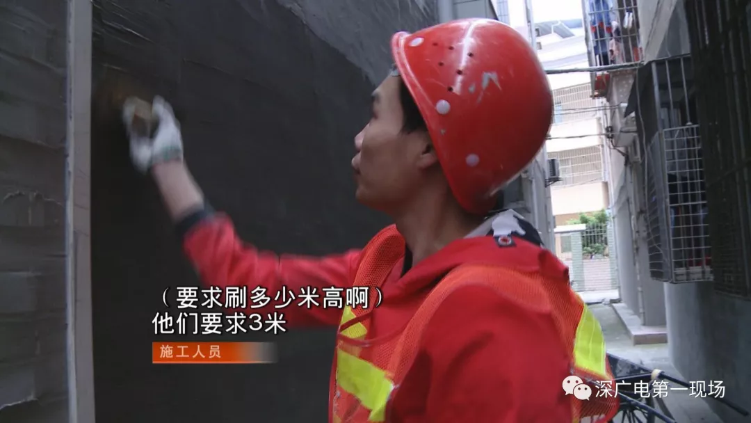 這里是龍華區(qū)觀湖街道辦福樓村里的城中村,這些居民樓的小巷子里,在這兩天來,有不少施工人員正在這里粉刷外墻?,F(xiàn)場施工人員說,他們只刷房子的底下一層。
