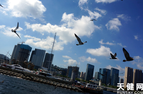 藍天白云,海風(fēng)拂面,潮水拍岸,海鷗翱翔,東港商務(wù)區(qū)高樓林立,綻放壯觀魅力