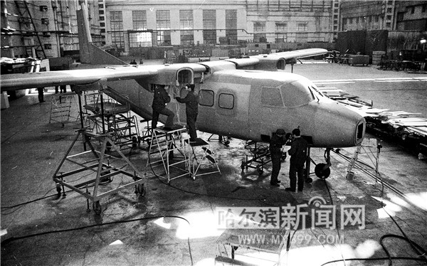 哈爾濱飛機制造公司自行研制的運12多用途民用飛機取得了國內(nèi)首份按國際規(guī)范研制的民用飛機“型號合格證”,圖為當年的制造車間。