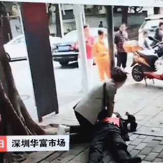 一名過路女子和一名男子接力為他實施心肺復(fù)蘇,直到急救人員趕來。